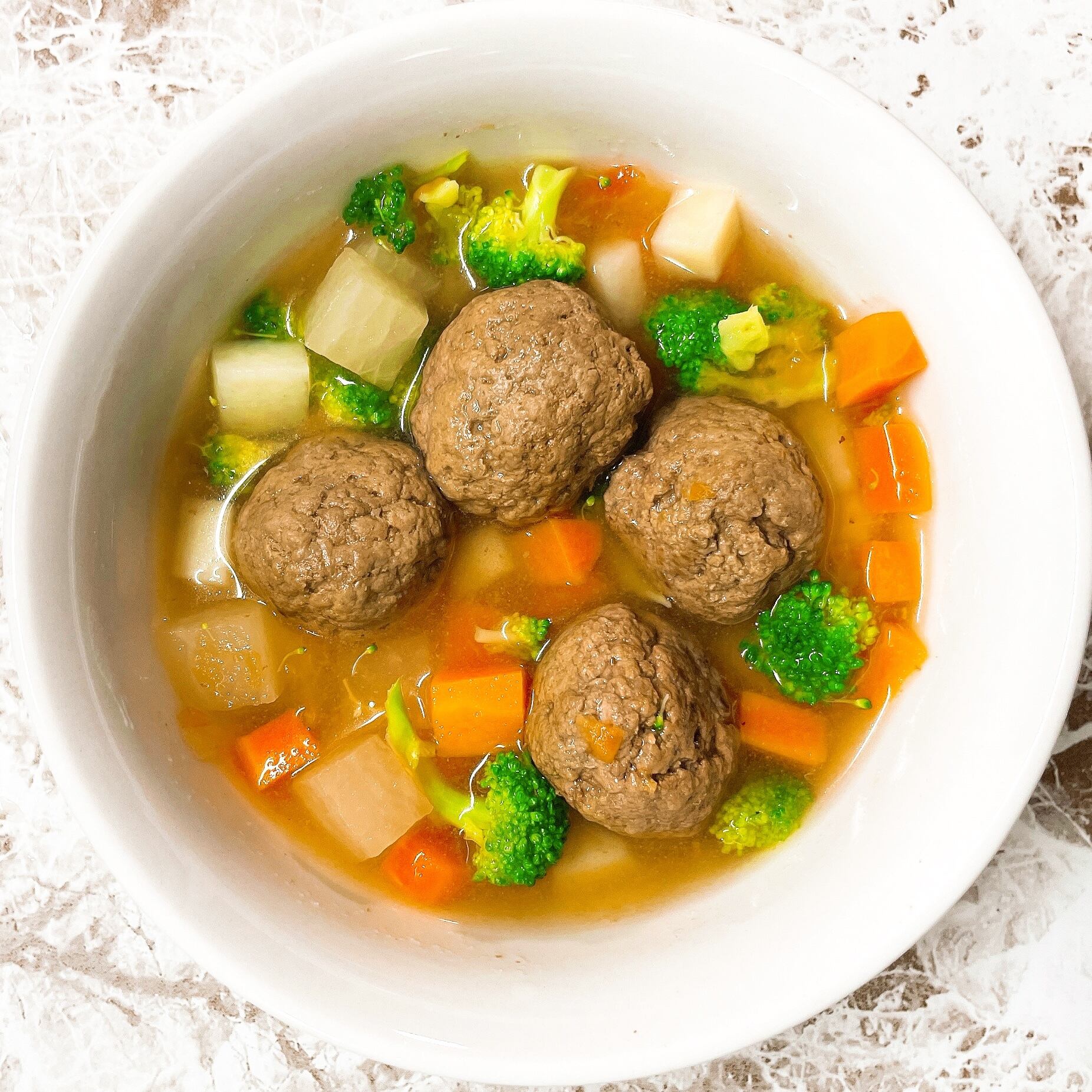 北海道産エゾシカをつなぎは使わずミートボールにし、一から取ったお出汁と5種類の野菜と一緒にじっくり煮込みました♪鹿肉は80g使用しており食べ盛りのわんちゃんも大満足の一品です。